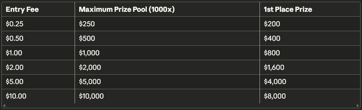 All paid entry tournaments feature multipliers ranging from 3x to 1000x your entry fee: